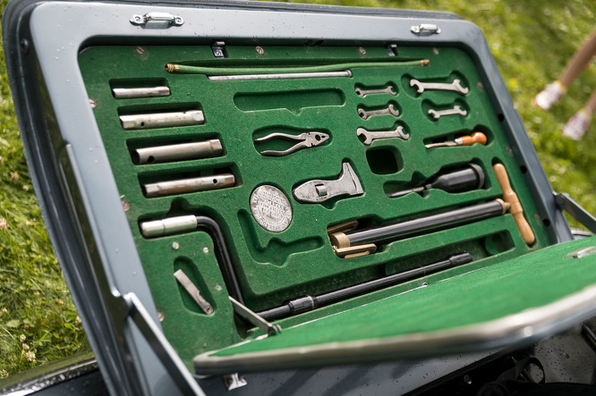 Tak čo s nimi, kúpili si väčší stroj. Niekoľko rokov Martin brouzdal po internete až nakoniec kúpil takúto krásnu opachu. Zaujímavostí na mašinke je viacej, ale mňa oslovilo dvojité veko kufra. Po otvorení tajného priečinku sa objaví originálne náradie, krásne a prehľadne usporiadané. Krása, tlieskam.